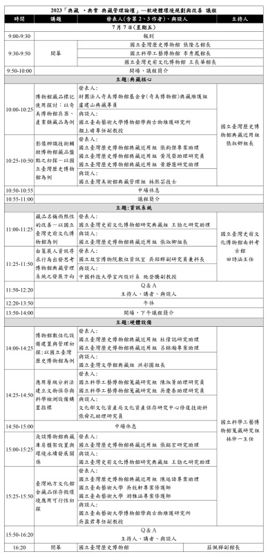 自2021年開始、一年一度的「典藏‧典常」典藏管理論壇,於7月7日圓滿落幕。繼前二年廣受佳評後,國立臺灣歷史博物館(以下簡稱臺史博),再度攜手國立科學工藝博物館(以下簡稱科工館)、國立臺灣史前文化博物館(以下簡稱史前館)及中華民國博物館學會藏品安全與維護委員會的夥伴們,以博物館典藏的「軟硬體環境規劃與改善」為主題,透過博物館典藏實務對話與交流,分享彼此經驗,共同解決當下典藏管理所面臨的挑戰,進而提升國內博物館典藏管理的專業能量。 本次論壇探討了藏品標記、盤點、典藏管理系統、藏品檢索、數位化、庫房櫃架、微環境保存等軟硬體規劃與改善之實務案例,共計8篇文章發表。為促進博物館典藏管理社群的進步,除主辦單位外,亦邀請國內各大博物館如國立故宮博物院、奇美博物館等實際執行典藏管理工作之實務人員發表,說明在其單位面臨的種種考驗,透過相關案例提出解決方案,分享工作成果,並請相關專家學者擔任與談人,共307名博物館相關人員報名。 臺史博館長張隆志、科工館館長李秀鳳及史前館王長華館長致詞提到博物館典藏工作有別於展示或教育活動業務,累積的成果較難以露出,但卻是博物館最重要的核心工作,也因此各館將典藏管理實績經驗,透過工作中所面對的問題進行跨館交流,實有助於後續實務參考。近年,如何因應社會趨勢、博物館的發展及科技結合典藏管理,為全球博物館界思考與重視的議題。未來臺史博將繼續與各館通力合作,期待本論壇成為典藏專業的交流平臺,逐步論述「典藏管理學」,進而推動國內博物館典藏管理的專業發展,進而與國際對話。
